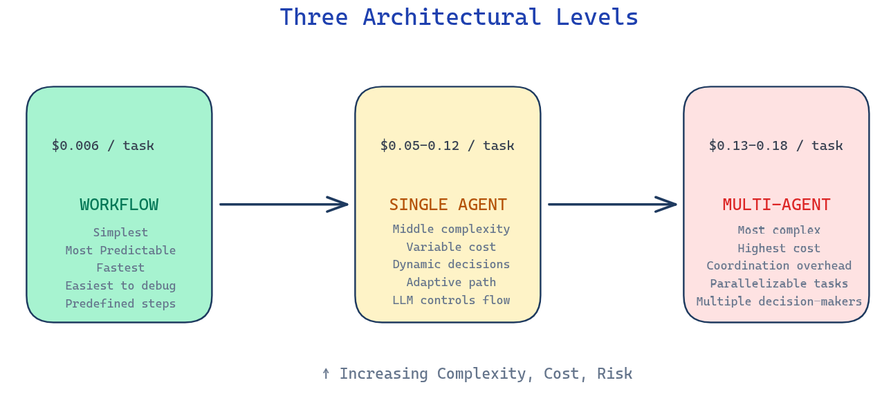 Cost difference is 20-30×—workflows $0.006, agents $0.12, multi-agent $0.18 per task