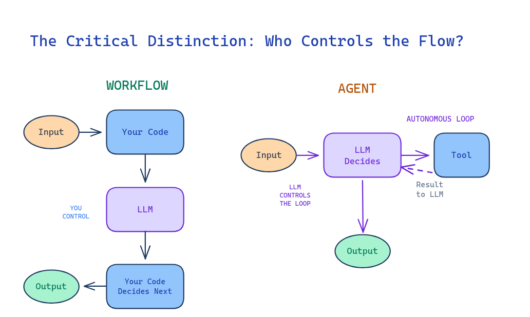 The autonomous loop—feeding tool results back to the LLM to decide the next action—is what separates agents from workflows.
