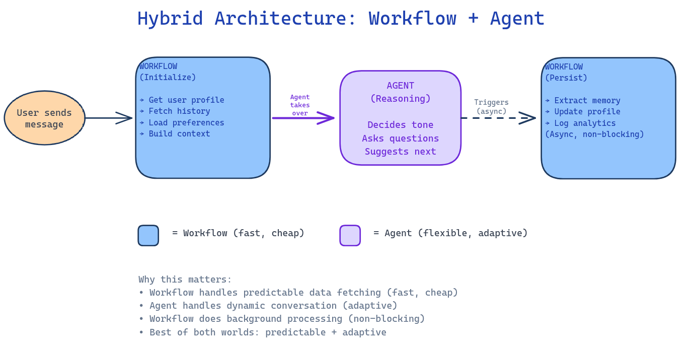 Why this matters: If you made the agent retrieve user data, you'd burn tokens on SQL query generation for something a simple DB lookup does better. If you made a workflow generate responses, you'd have rigid, robotic replies.